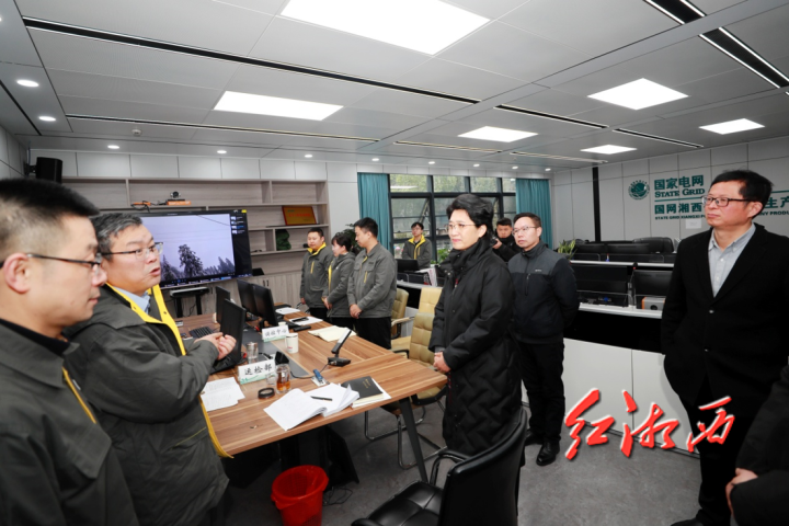 在國網湘西電力公司指揮調度中心,陳華對國網公司為全州電力順暢保供表示感謝,對在一線艱苦地區破冰融冰的工作者表示敬意。她勉勵工作人員堅守好工作崗位,強化科技融冰,加強與各縣市聯動,在確保自身安全的條件,全力做好電力保供工作。