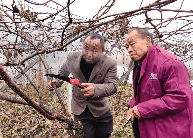 石紹生(右)指導獼猴桃育苗大戶王兵進行冬季培管。