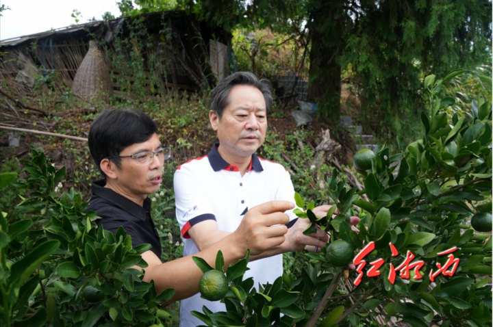 虢正貴在潭溪鎮朱雀洞村調研鄉村振興工作,并在椪柑種植基地察看椪柑掛果情況。