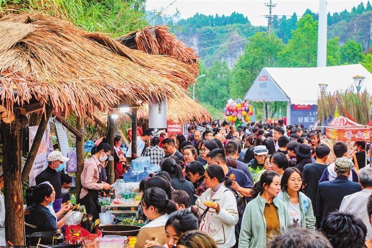 “村集”上人潮如織,游客們嘴里吃著,手上提著,收獲滿滿。 團結報見習記者 胡承鼎 攝