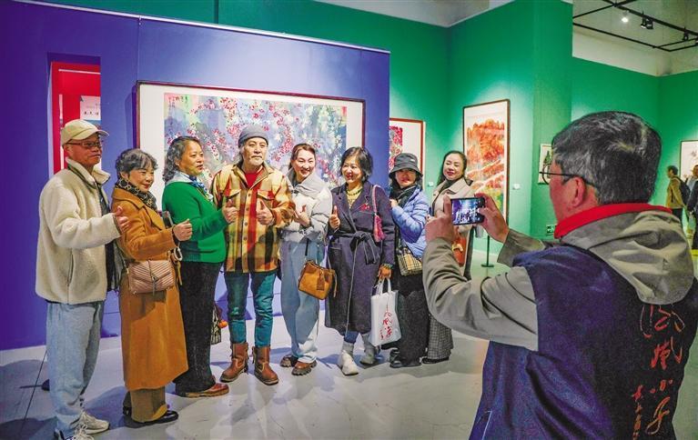 展廳中央一幅名為《芙蓉國里盡朝暉》的畫作,吸引了諸多參觀者的目光。此幅畫作長570厘米,寬250厘米,畫面中生動地繪著數枝荷花,在金色的朝霞中搖曳生風,暗送荷香,精致細膩的荷花卻展現出大氣磅礴的氣勢。觀展者或湊近仔細端詳那細膩的筆觸,或站在稍遠處感受整體的意境,無不嘖嘖稱嘆。