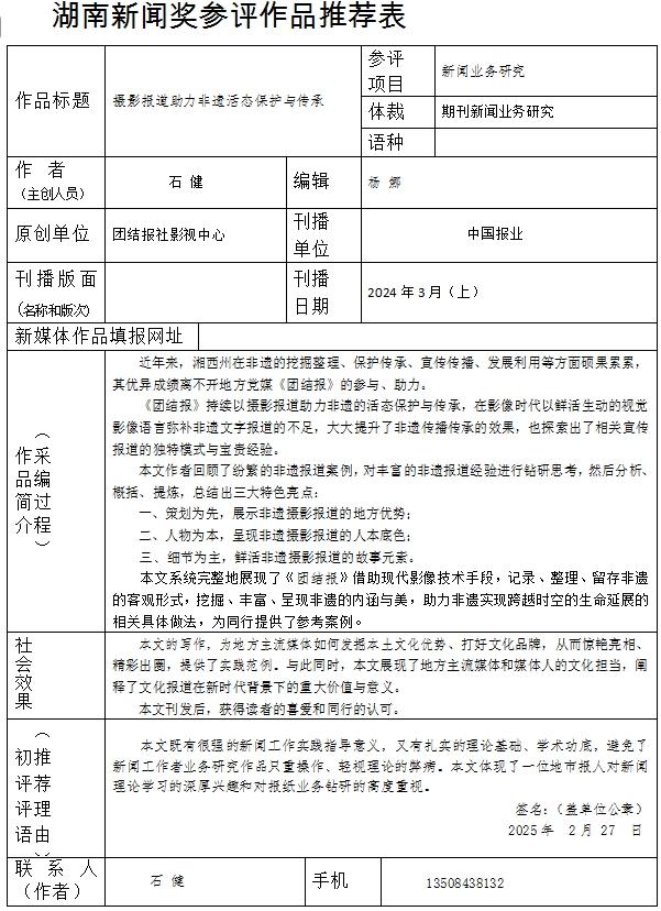 多年來,《團結報》非遺攝影報道在全國性攝影大賽以及中國地市報、湖南省市州報、湖南新聞獎等各大新聞及藝術攝影競賽中屢屢斬獲頭獎、摘得桂冠,碩果累累,成績喜人。近年來,非遺攝影報道在完成內容生產后,通過“紅湘西”客戶端、“湘西頭條”微信公眾號等開辟專題欄目,在原有基礎上加入視頻、音樂和文字內容,進行融媒傳播、立體宣傳,滿足了新時代受眾多元化的信息接受方式,使其覆蓋面更廣泛、傳播更有效。