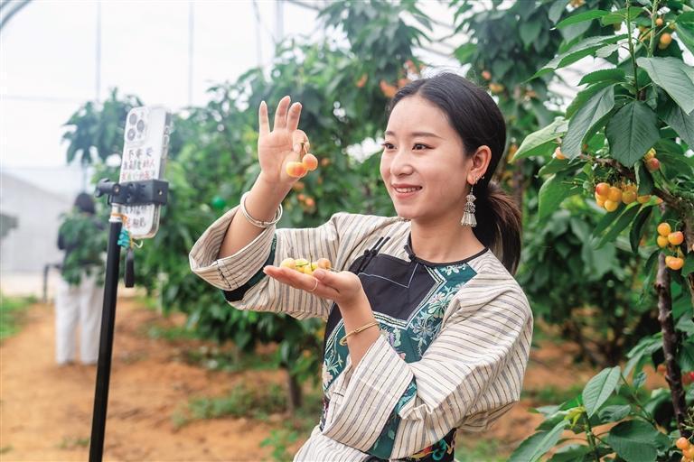 主播在櫻桃園里開起直播,線上推介好吃的櫻桃。