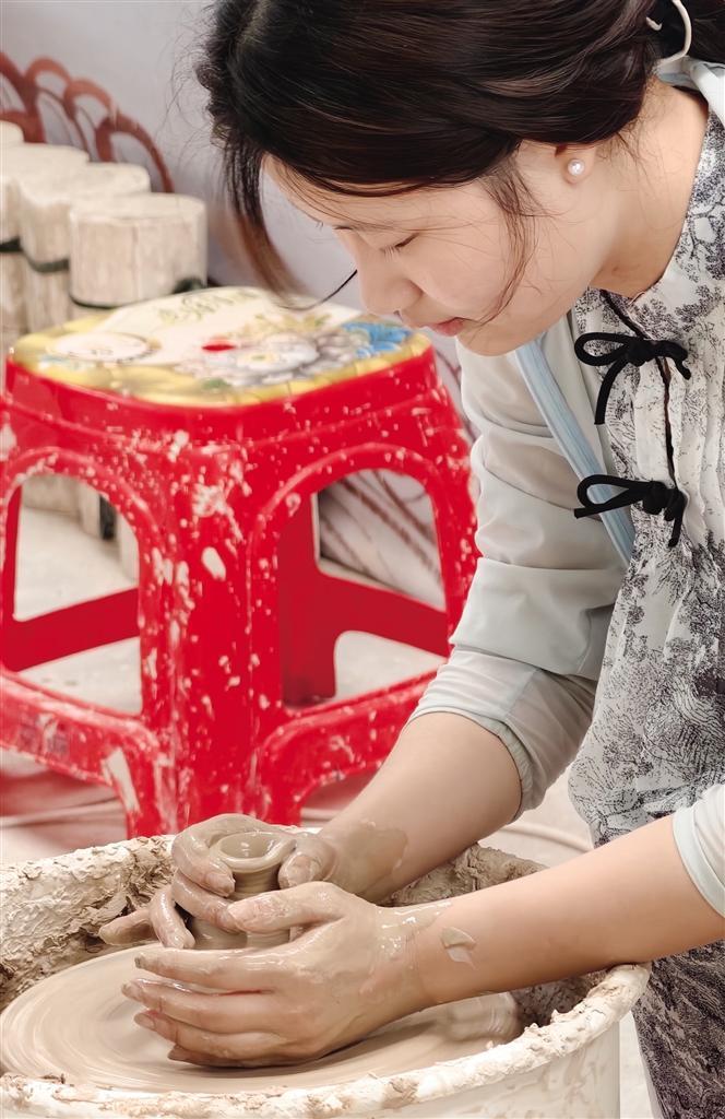 游客體驗陶藝制作。