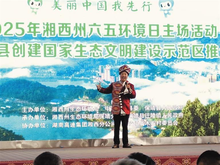 2025年“六五”環境日主場活動在保靖縣遷陵鎮隴木峒村舉行。村民用土家族藝術表演形式展現全州干部群眾學習踐行“兩山”理念的實績實效。