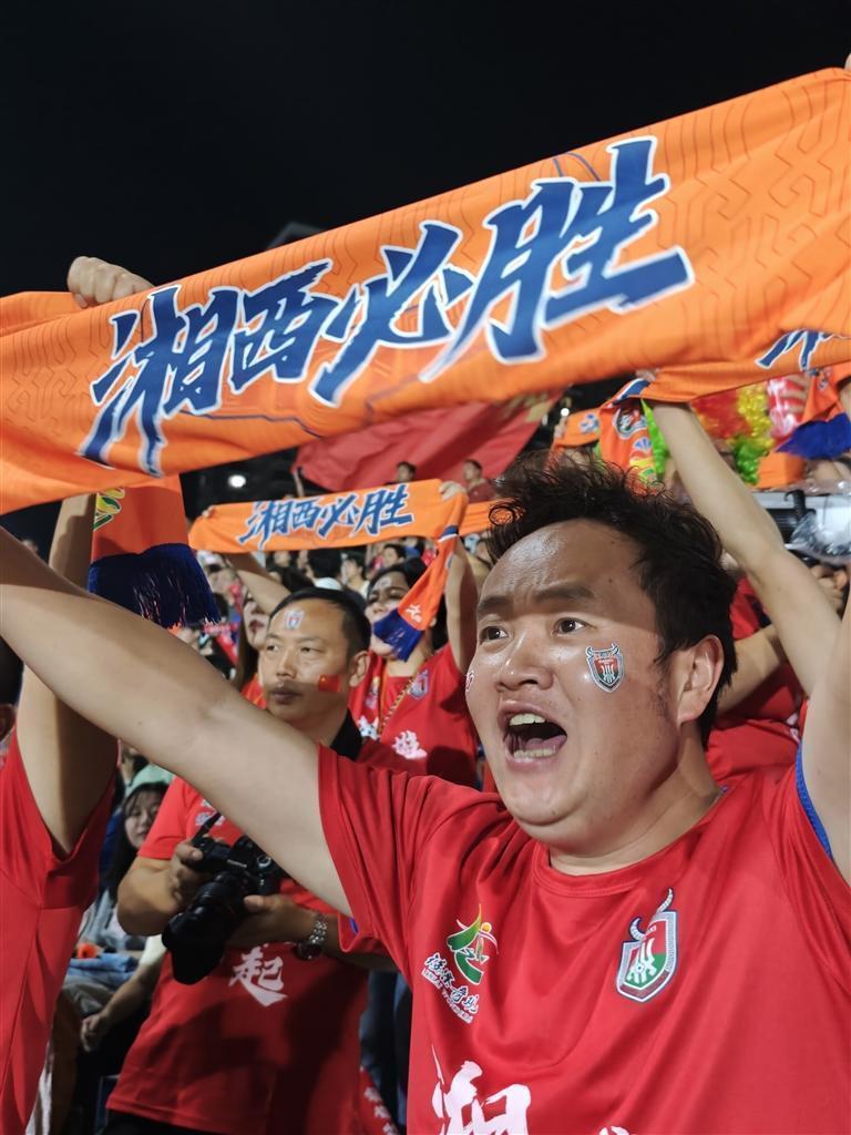 湘西球迷高舉“湘西必勝”橫幅,為湘西隊加油。 團結(jié)報全媒體記者 朱開朗 攝