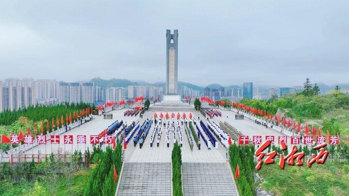 方陣前,以州委、州人大常委會、州政府、州政協、吉首軍分區,吉首市委、市政府以及社會各界名義敬獻的7個大型花籃依次排列。花籃紅色緞帶上,“烈士永垂不朽”金色大字熠熠生輝。