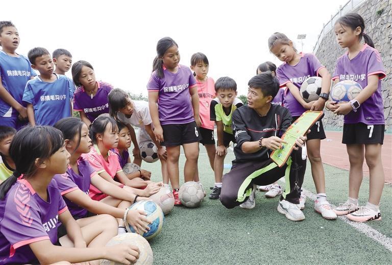 9月22日,保靖縣毛溝小學(xué),教練在給小球員們講解足球戰(zhàn)術(shù)。 俞采華 攝