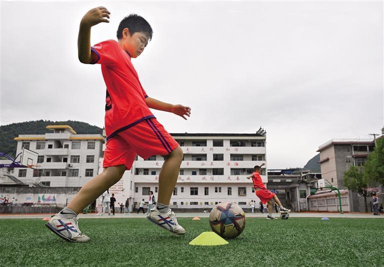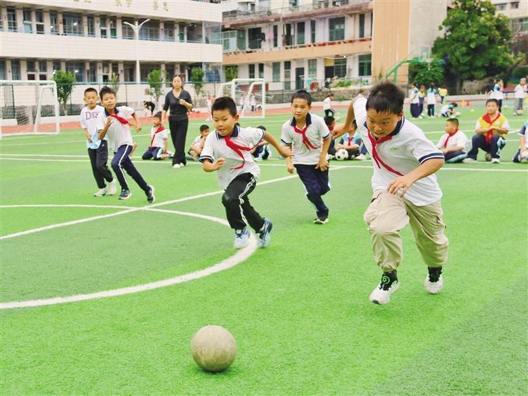 9月23日,花垣縣花垣鎮(zhèn)團(tuán)結(jié)中心小學(xué)學(xué)生在練習(xí)踢足球。 龍恩澤 攝