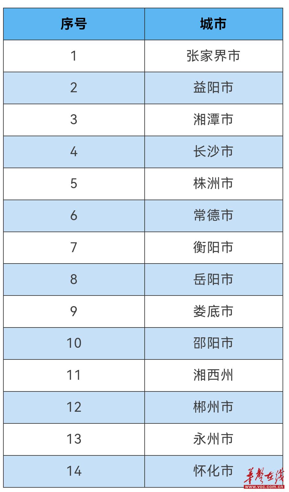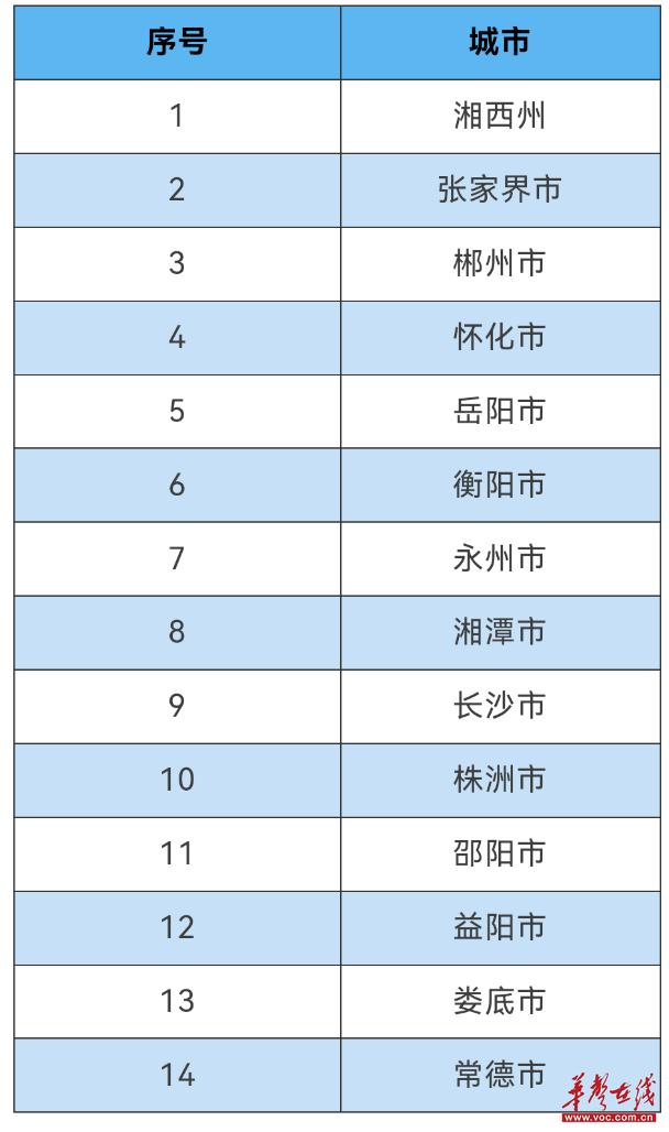 按PM?.?濃度同比變化,從好到差依次為:張家界市、益陽(yáng)市、湘潭市、長(zhǎng)沙市、株洲市、常德市、衡陽(yáng)市、岳陽(yáng)市、婁底市、邵陽(yáng)市、湘西州、郴州市、永州市、懷化市。