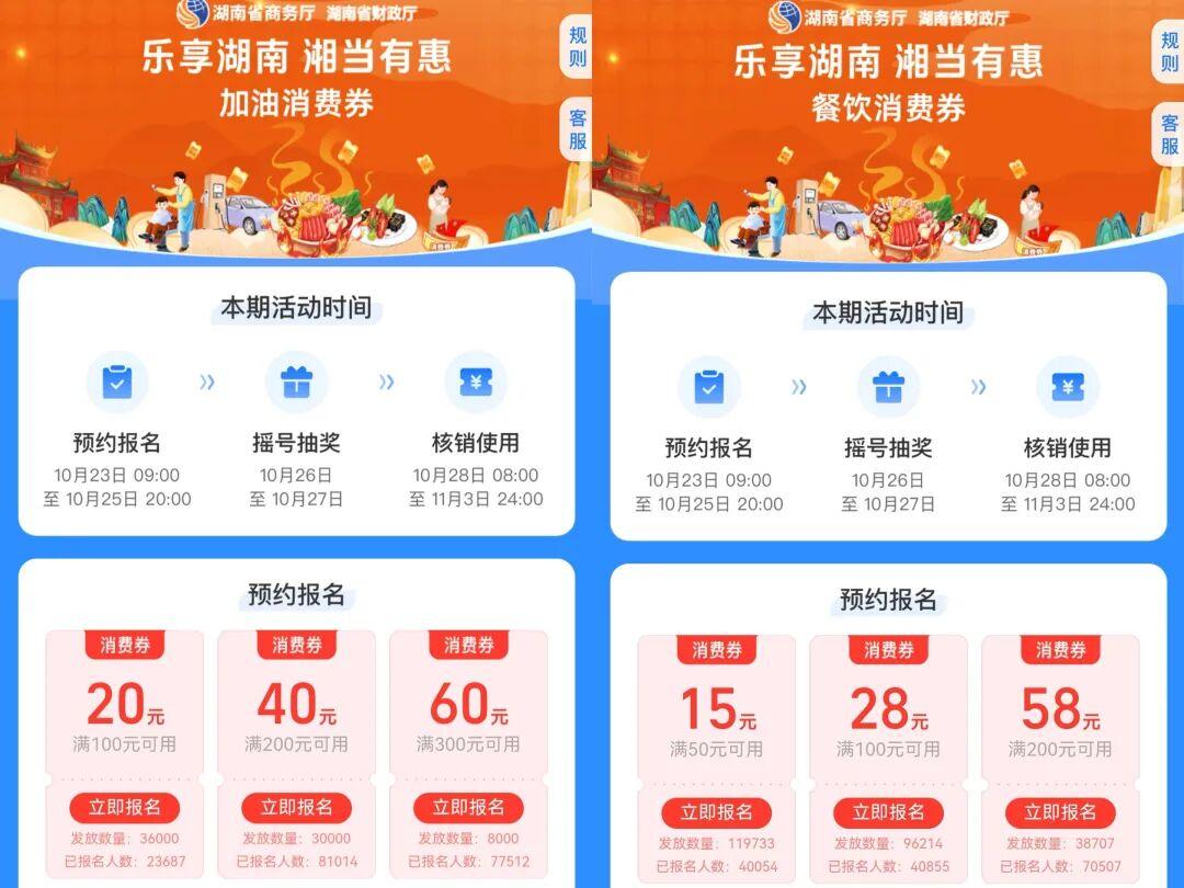 活動(dòng)期間(10月至12月),湖南在全省范圍內(nèi)發(fā)放總金額達(dá)1億元的消費(fèi)券,采用“報(bào)名搖號(hào)”機(jī)制,無需搶券,讓消費(fèi)者公平參與。10月23日至25日為消費(fèi)者報(bào)名期。