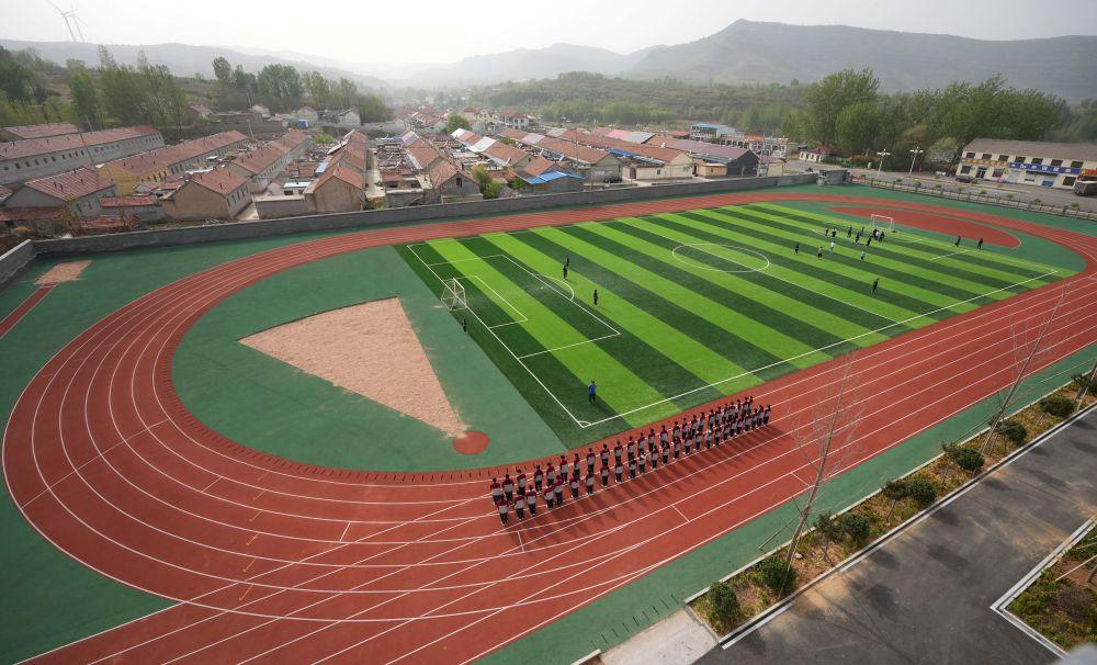 在位于山東濰坊市臨朐縣石家河村的臨朐縣彌水教育集團石家河校區(qū),學(xué)生在操場塑膠跑道上進(jìn)行體育鍛煉(2025年4月17日攝)。新華社記者 徐速繪 攝