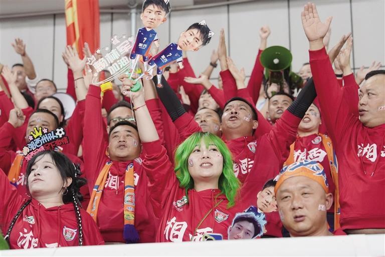 “我們來自湘西,堅毅如武陵山,酉水河在熱血中流淌……同戰斗,共進退,捍衛血色湘西隊!”看臺上,《湘西戰歌》的旋律一遍遍地響,歌詞里藏著球迷對球隊、對家鄉最赤誠的熱愛。