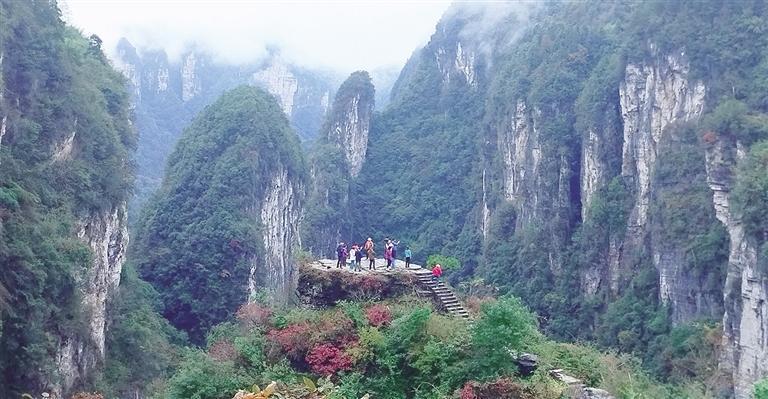 11月7日,雨后的吉首市德夯大峽谷愈發(fā)清麗秀氣,云霧纏繞在奇峰、峽谷之間,縹緲翻飛,宛如仙境,讓人迷醉其中。圖為游客在天問臺拍照、游玩。 團結(jié)報全媒體記者 石秋云 攝
