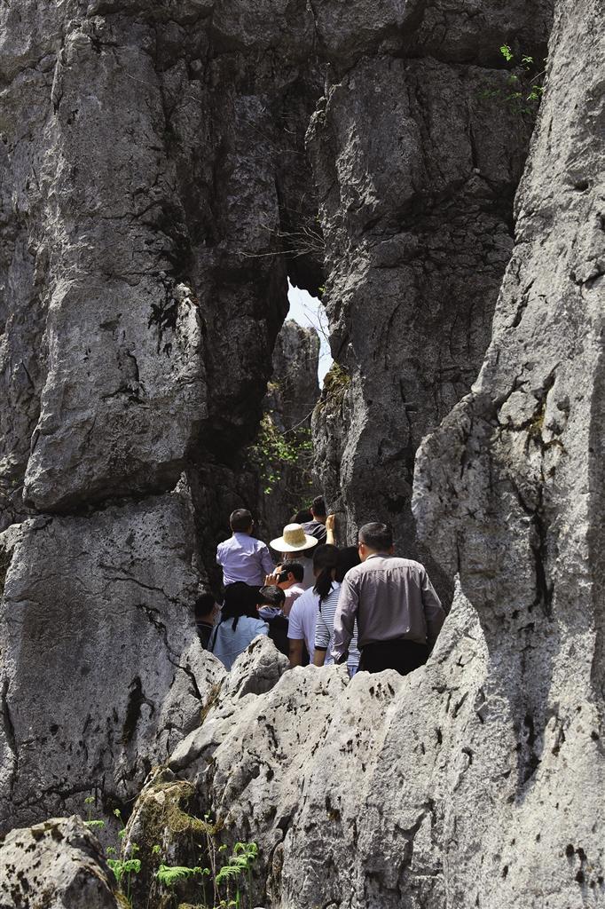 洛塔最為人熟知的莫過于石林了,楠竹石林的峰叢似龍鱗,龍脈一樣地蜿蜒在此。兩億五千萬年前,這里曾是神奇的海底世界,化石就是最好的訴說者。后因海陸變遷,土下溶蝕形成了石芽石柱等,塔狀錐狀高低錯落,形成了大量的象形景觀,引人無限遐想。其中,有五虎趕六羊、望夫巖、錦雞獨立等奇特石景。沿幽徑穿行于石林,來到了六道門。我抬頭仰望,想到了英國史前遺跡巨石陣,猜想這里是否曾是祖先舉行祭祀儀式或通往神秘之地的門戶。