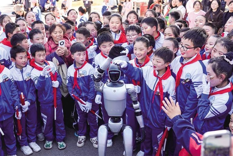 圖為學(xué)生們與機(jī)器人互動(dòng)。