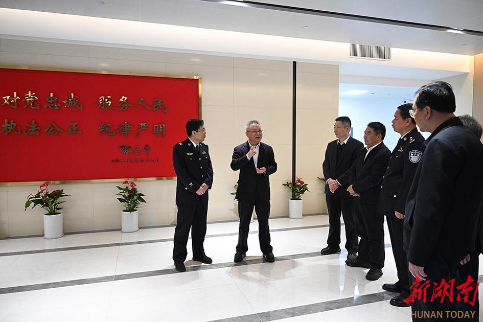 來到省公安廳刑事科學技術研究所和偵查(反詐)中心,沈曉明走進相關實驗室,了解刑事科學技術發展、打擊電信詐騙等情況。在湖南警察學院低空安全治理實驗室,沈曉明詳細了解警用無人機實戰應用場景、產學研融合以及公安人才培養等情況。沈曉明還參觀了“十四五”湖南公安成果展、公安部智慧軟件研發中心(長沙)成果展、新質戰斗力裝備展,并察看了移動警務指揮平臺和公安民警訓練情況。