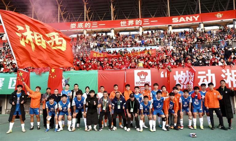 12月6日,湘超聯賽常規賽最后一輪,湘西隊客場不敵婁底隊,未進入淘汰賽而結束今年聯賽之旅。賽后,湘西隊球員與教練來到看臺前感謝湘西球迷并與球迷合影,球迷打出“湘西勇士,我們等你滿血歸來”的橫幅。 團結報全媒體記者 胡承鼎 攝