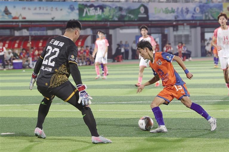 10月11日,“湘超”第五輪,湘西隊主場迎戰常德隊。面對被譽為“穿得最粉,踢得最狠”的常德隊,湘西隊選擇以攻對攻,踢出一身昂揚少年氣。圖為瘦小的劉云合晃過對方高大守門員,打進本場比賽中個人第二粒進球。 團結報全媒體記者 胡承鼎 攝